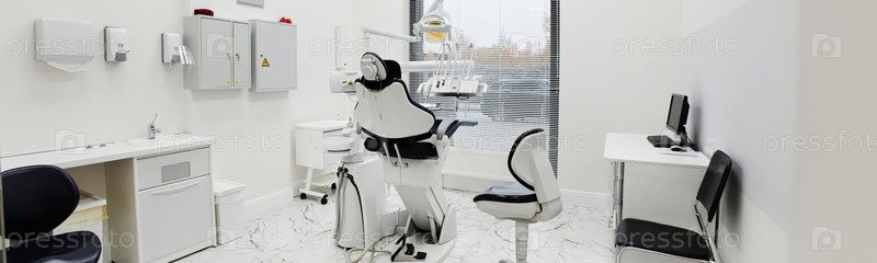 Пустой стоматологический кабинет показывает современное оборудование, ожидающее прибытия пациентов