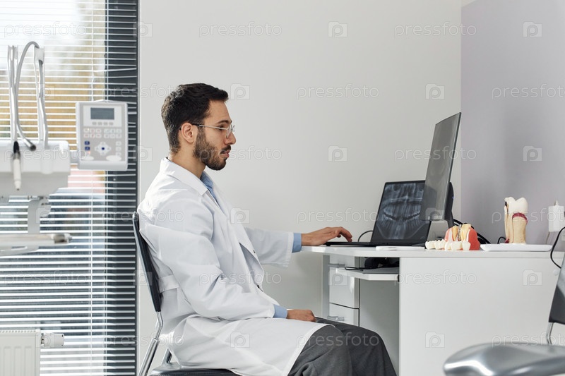 Ближневосточный мужчина Стоматолог просматривает записи пациентов на компьютере