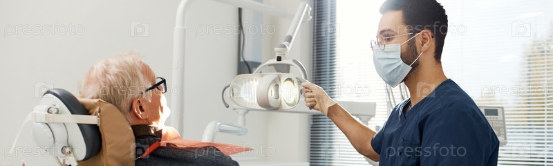 Мужчина сидит в стоматологическом кресле, пока зубной врач регулирует экзаменационный свет