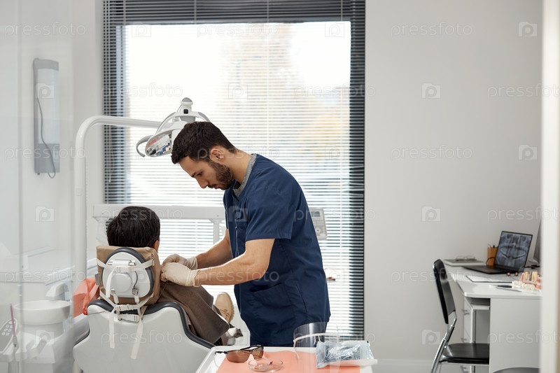 Стоматолог, осматривающий женщину-пациента в клинике Мужчина