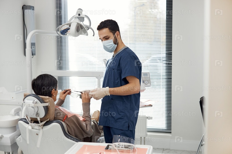 Женщина средних лет, посещающая стоматологический прием с мужчиной-стоматологом
