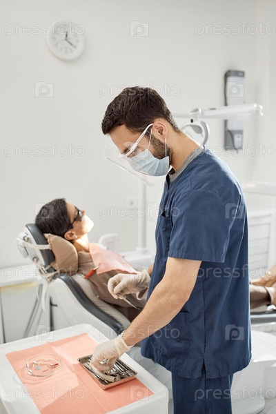 Стоматолог готовит инструменты для лечения пациентов мужского пола