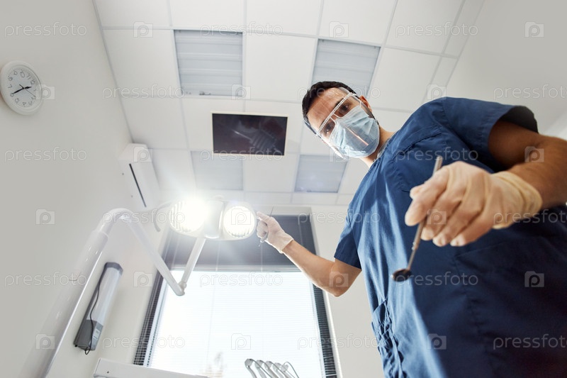 Молодой взрослый мужчина Стоматолог, регулирующий свет над головой Подготовительный экзамен