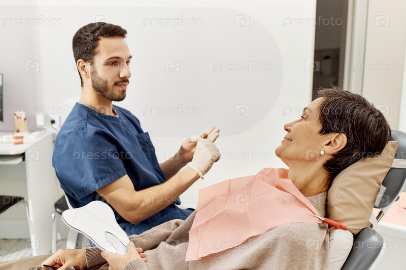 Женщина средних лет разговаривает с молодым взрослым стоматологом в клинике