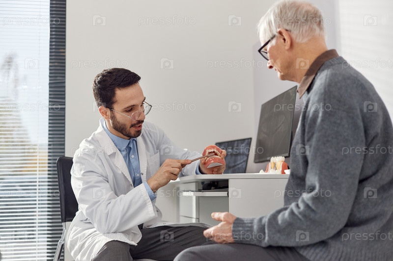 Ближневосточный мужской стоматолог объясняет зубную процедуру старшему человеку