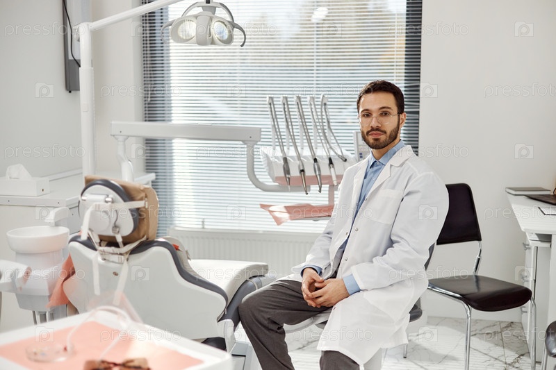 Молодой взрослый мужчина-стоматолог сидит в стоматологическом кабинете и смотрит на камеру