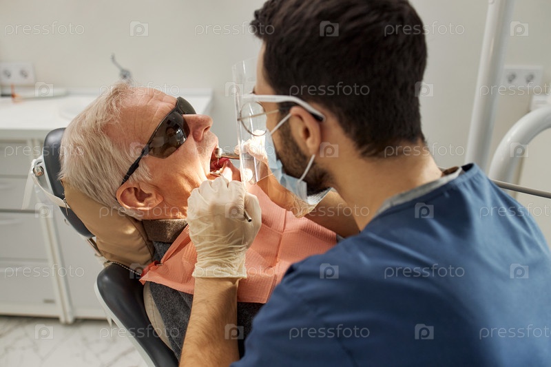 Мужчина, получающий стоматологический осмотр от молодого взрослого мужчины Старший дантист