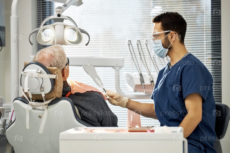Зубной врач показывает старшего мужчину зубное зеркало Мужчина
