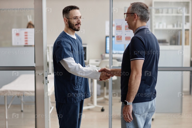 Мужчина среднего возраста приветствует молодого взрослого мужчину дерматолога