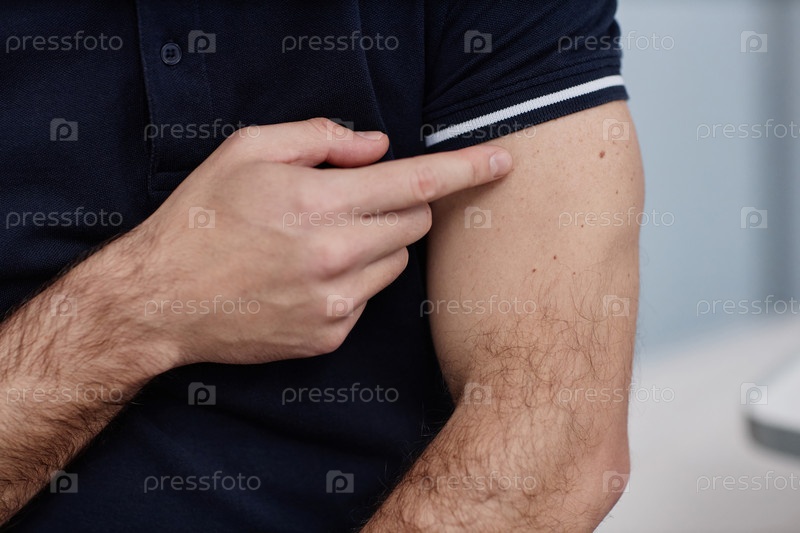 Мужчина, указывающий на родинку на руке во время дерматологического визита