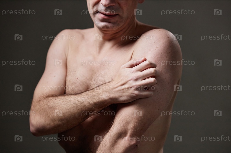 Мужчина среднего возраста царапает кожу на руке