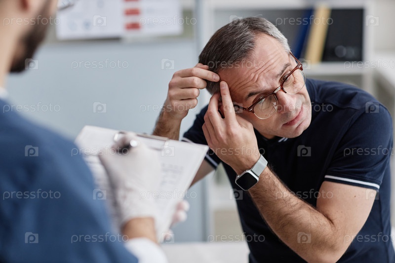 Мужчина среднего возраста консультирует дерматолога по поводу проблем с выпадением волос