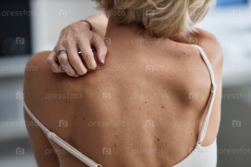 Женщина среднего возраста царапается по спине во время посещения дерматолога