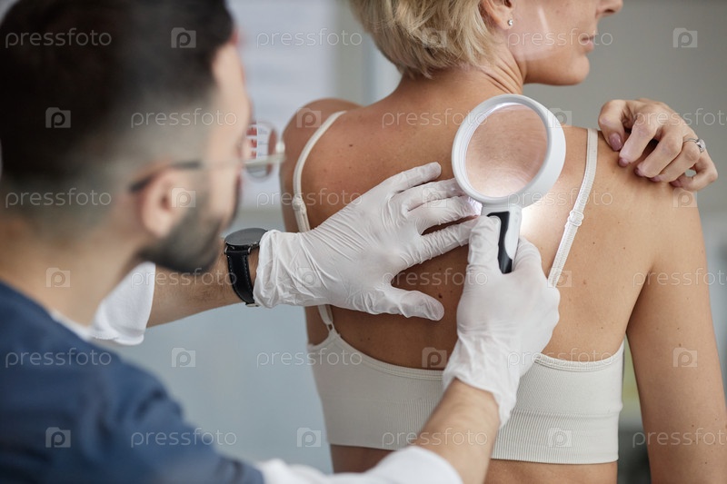 Женщина среднего возраста, проходящая обследование кожи дерматологом