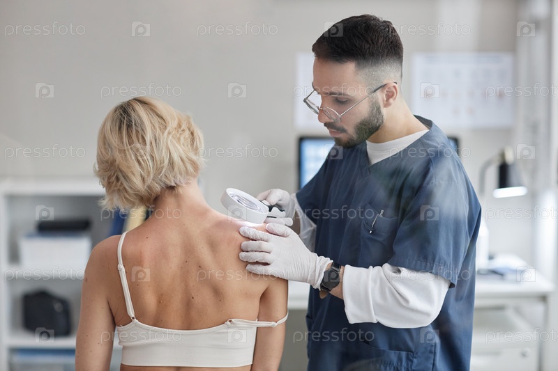 Женщина, проходящая осмотр кожи у мужского дерматолога