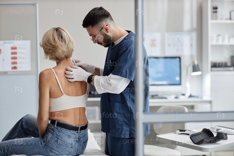 Женщина среднего возраста получает оценку кожи спины от мужского дерматолога
