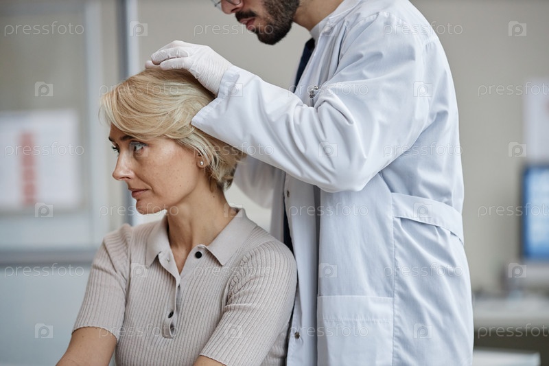 Женщина среднего возраста получает обследование кожи головы от мужского дерматолога