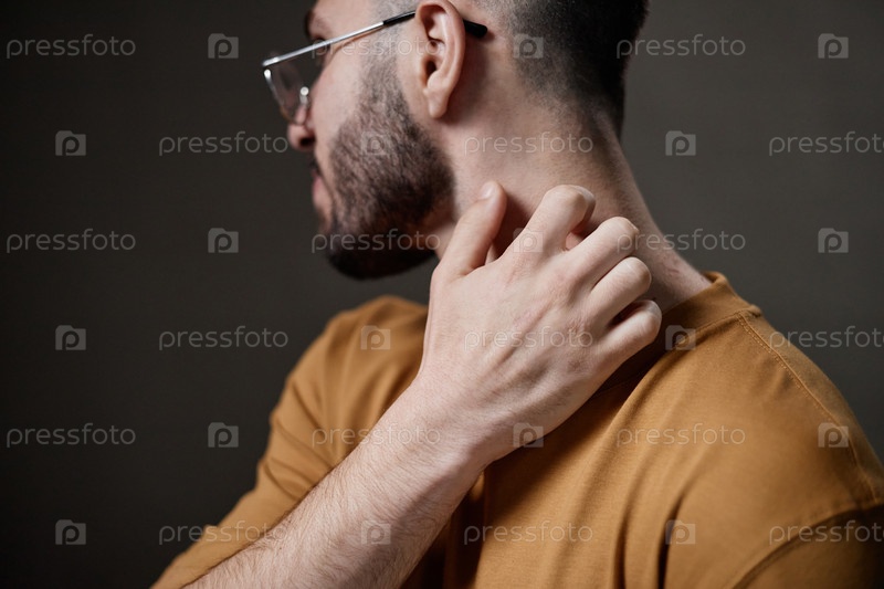 Молодой взрослый мужчина прикасается к шее испытывает дискомфорт на коже