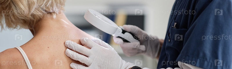 Женщина среднего возраста проходит скрининг задней кожи с помощью увеличивающего устройства