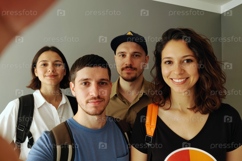 Портрет разных молодых взрослых, улыбающихся и позирующих вместе в помещении