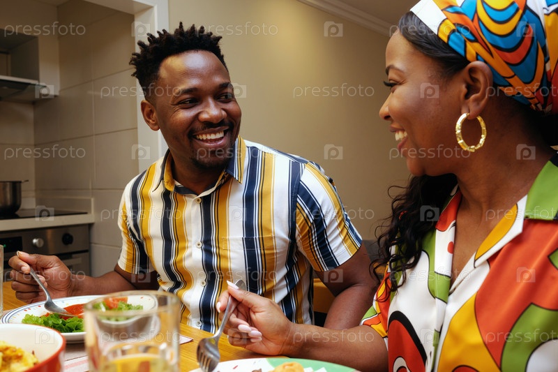 Юный чернокожий мужчина улыбается, когда ужинает с молодой чёрной женщиной в помещении