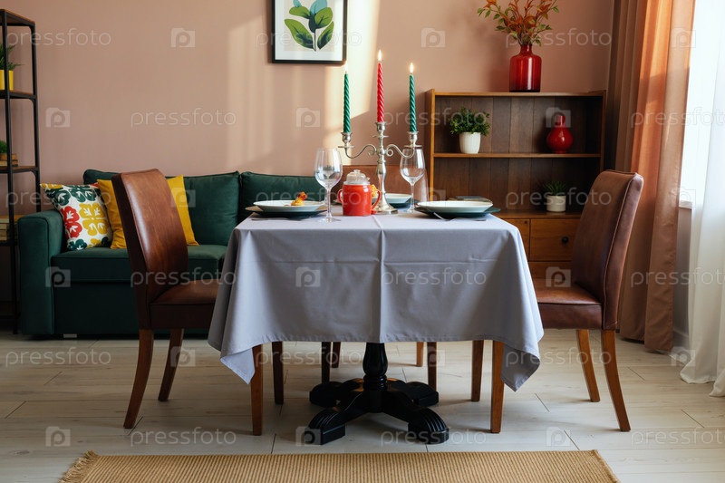 Романтическая столовая уборка с свечами, ожидающая гостей в уютной гостиной