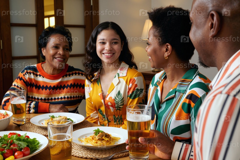 Многонациональная семья наслаждается ужином и беседой вместе за домашним столом
