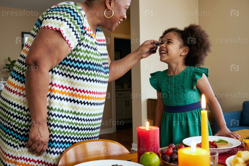 Черная женщина играет с улыбающейся черной девушкой во время семейного обеда за столом
