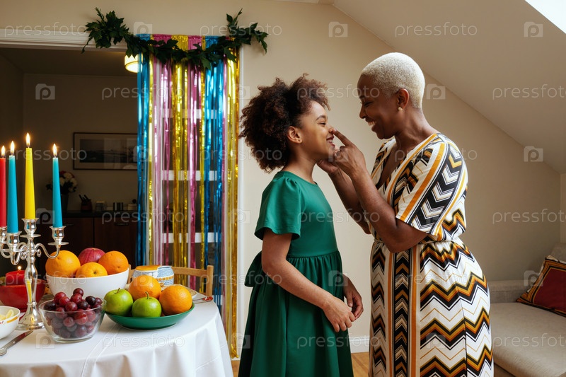Чернокожая женщина среднего возраста улыбается, настраивая платье молодой черной девушки