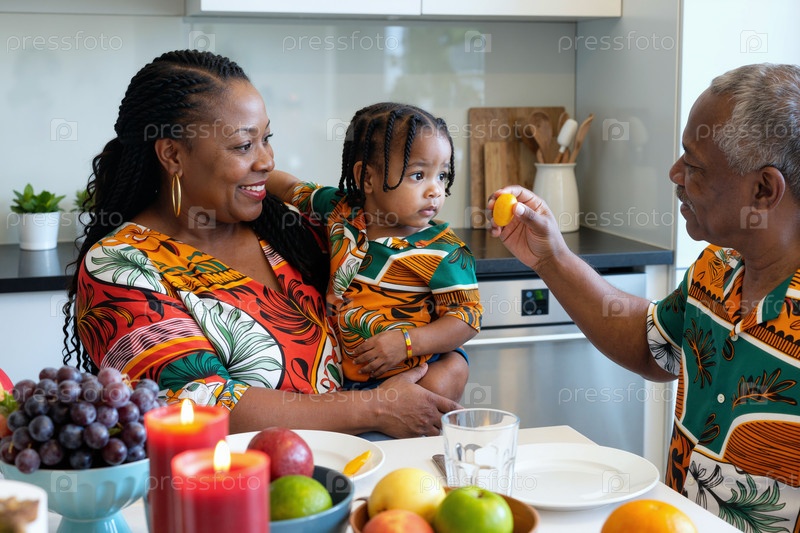 Чернокожая женщина среднего возраста держит ребенка, в то время как старший черный мужчина предлагает фрукты