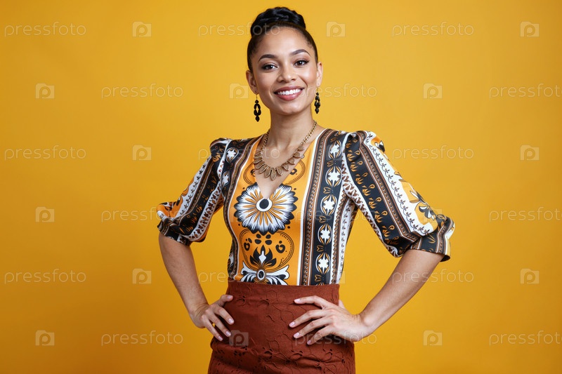 Портрет молодой взрослой чернокожей женщины, улыбающейся уверенно на желтом фоне