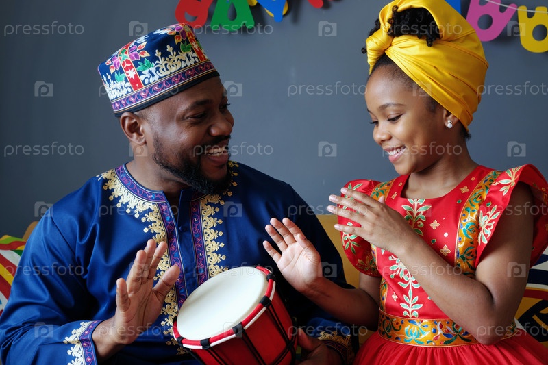Улыбающийся чернокожий мужчина и молодая чёрная девушка играют на барабанах и празднуют вместе