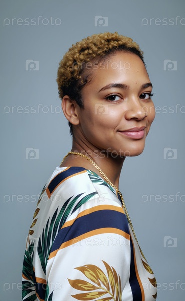 Портрет молодой взрослой чернокожей женщины, улыбающейся и смотрящей через плечо