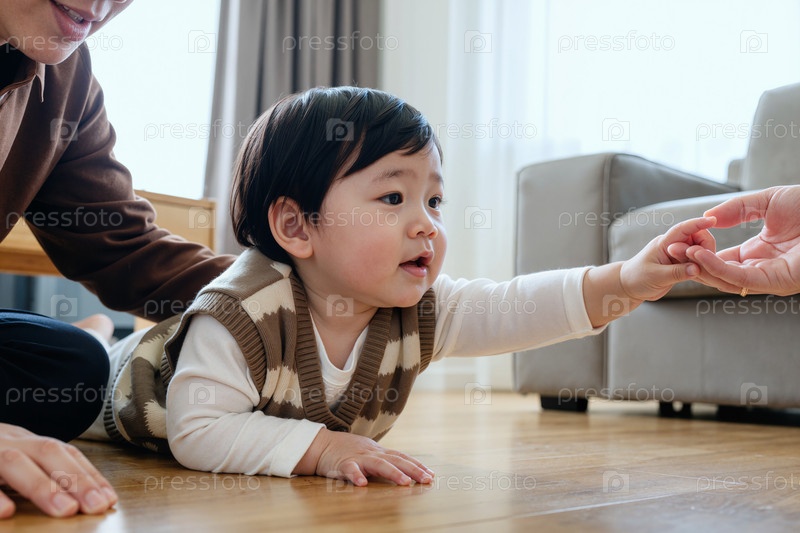 Малышкий мальчик достигает азиатской взрослой руки, ползу в помещении
