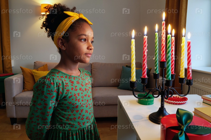 Молодая черная девушка, наблюдающая за свечами Кинара во время празднования Кванзаа