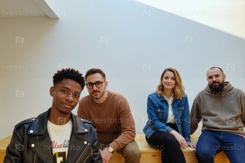 Мультиэтнические молодые взрослые сидят вместе и улыбаются в современной помещенной обстановке