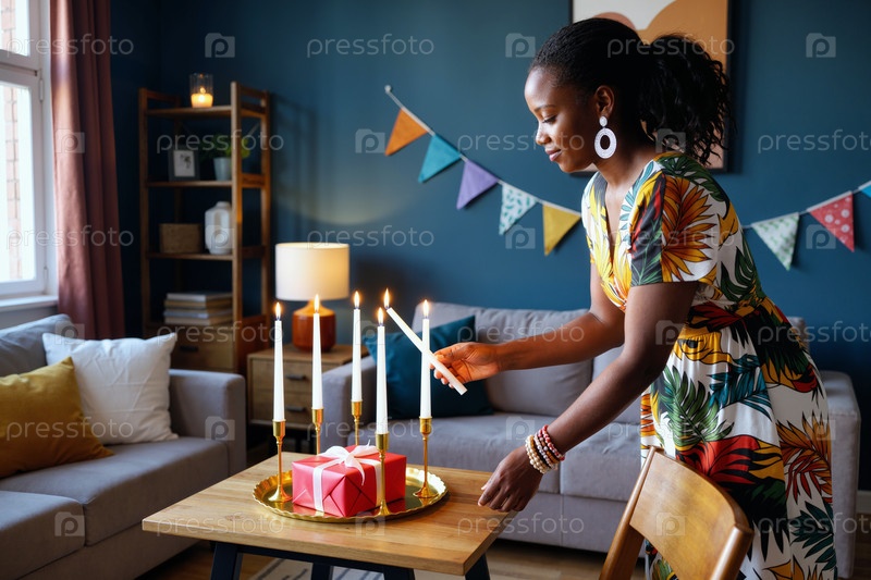 Молодая взрослая черная женщина зажигает свечи на столе во время празднования дня рождения