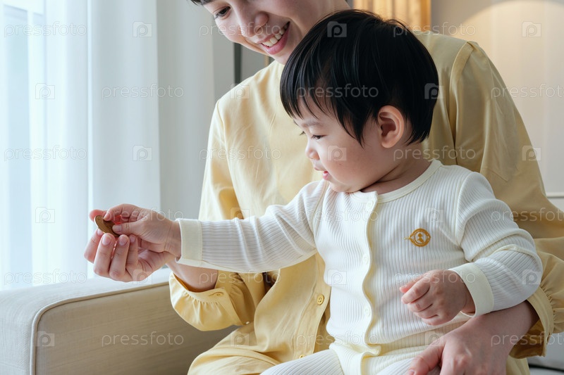 Молодая женщина улыбается, заботясь о ребенке, сидящем на ее коленях