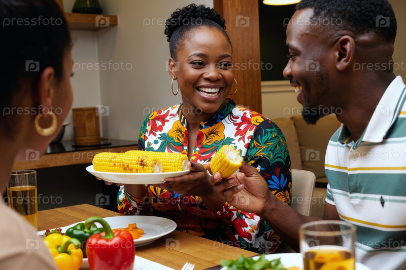 Молодая чернокожая женщина делится кукурузой с друзьями во время ужина, собирающегося в помещении