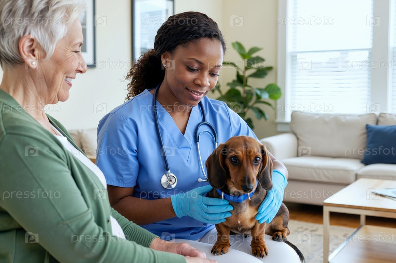 Молодая взрослая чернокожая женщина Ветеринарная экспертиза Дахшунд собака с старшей женщиной