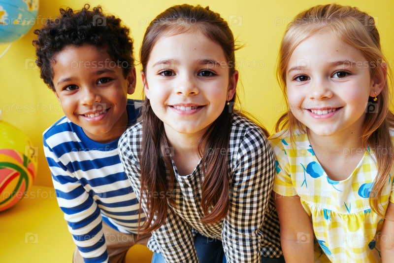 Портрет многонациональных детей, улыбающихся вместе на желтом фоне