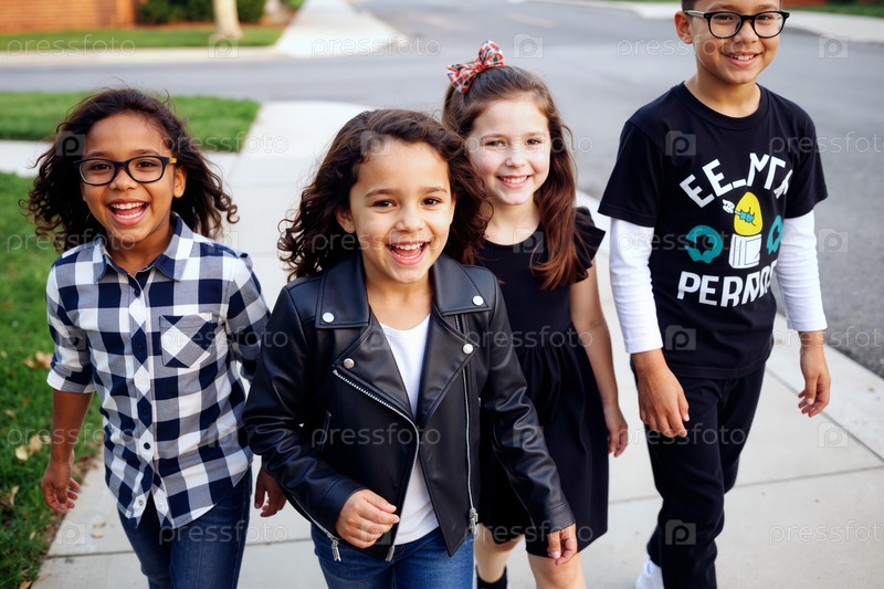 Группа разнообразных детей, гуляющих на свежем воздухе и улыбающихся перед камерой