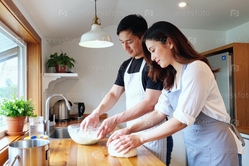 Молодая взрослая азиатская пара готовит тесто вместе на современной домашней кухне