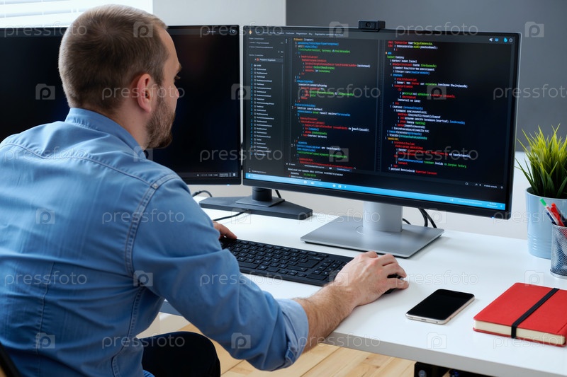 Молодой взрослый мужчина пишет код на компьютерных мониторах в офисной обстановке