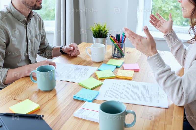 Молодой мужчина и женщина обсуждают бизнес-стратегию за офисным столом