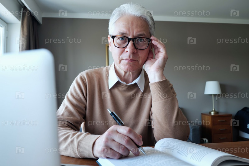 Портрет пожилого человека с очками, изучающего на столе в помещении