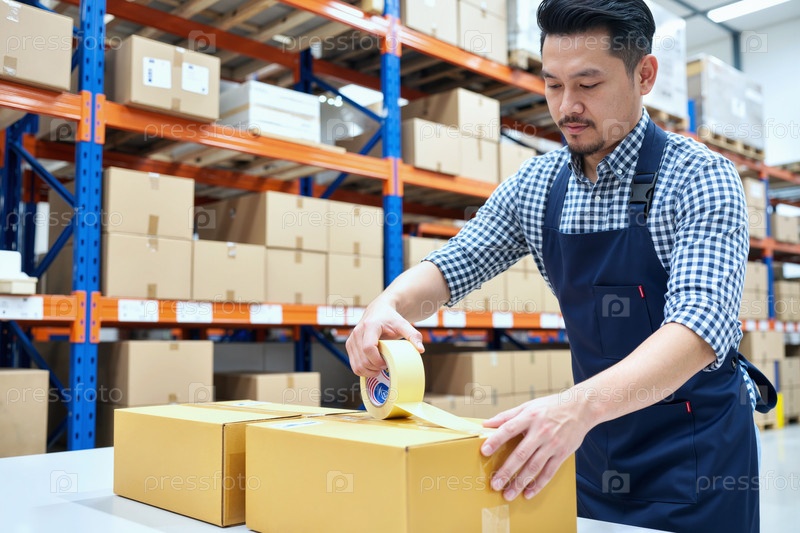 Молодой взрослый азиатский мужчина упаковывает картонные коробки в складское хранилище
