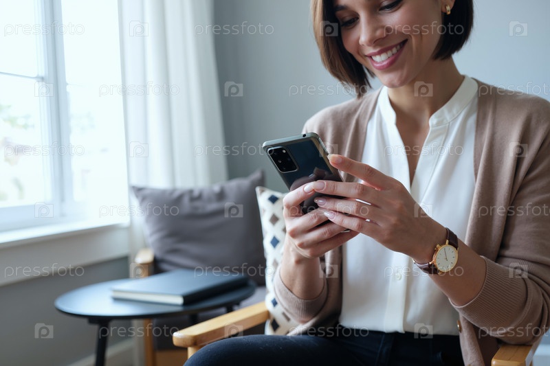 Молодая взрослая женщина улыбается, используя смартфон в помещении