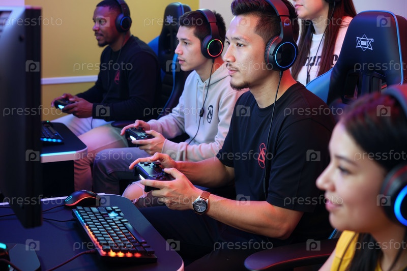 Мультиэтнические молодые взрослые играют в видеоигры вместе на Esports Arena