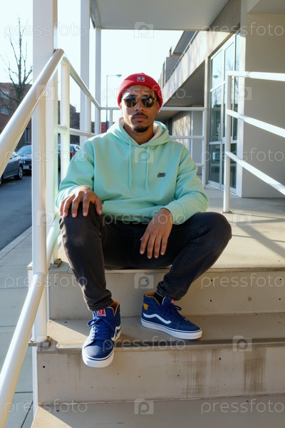 Молодой взрослый чернокожий мужчина сидит на уличной лестнице, надевая солнцезащитные очки и бейн